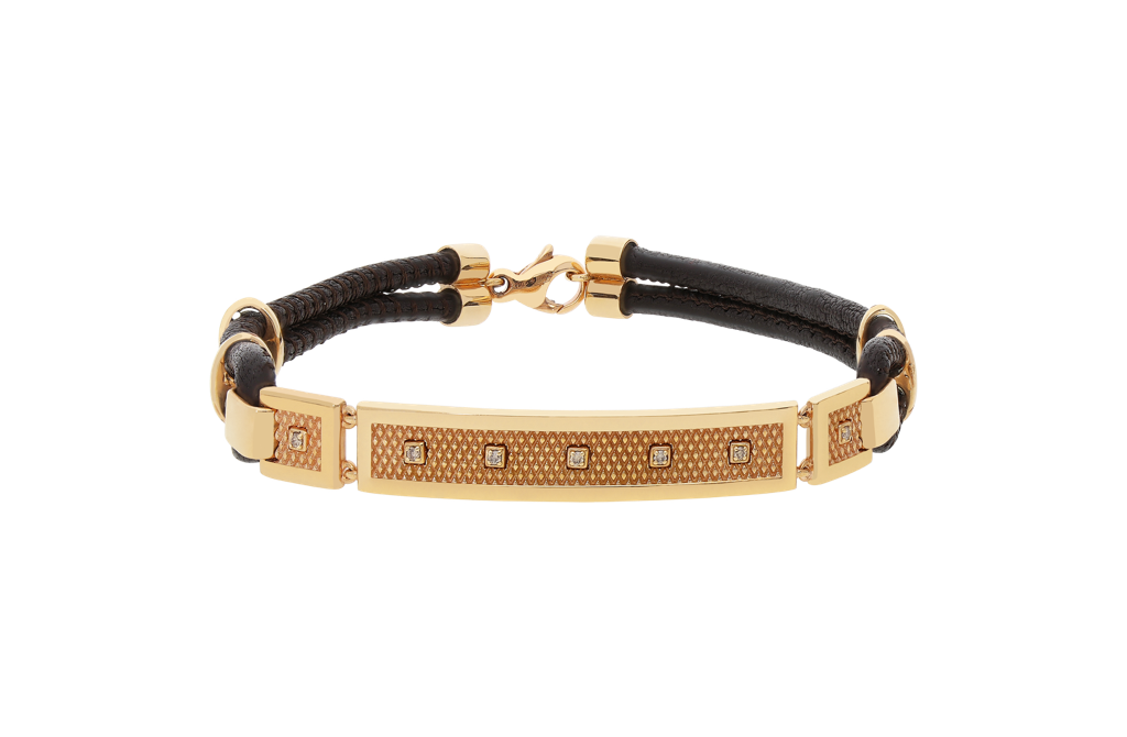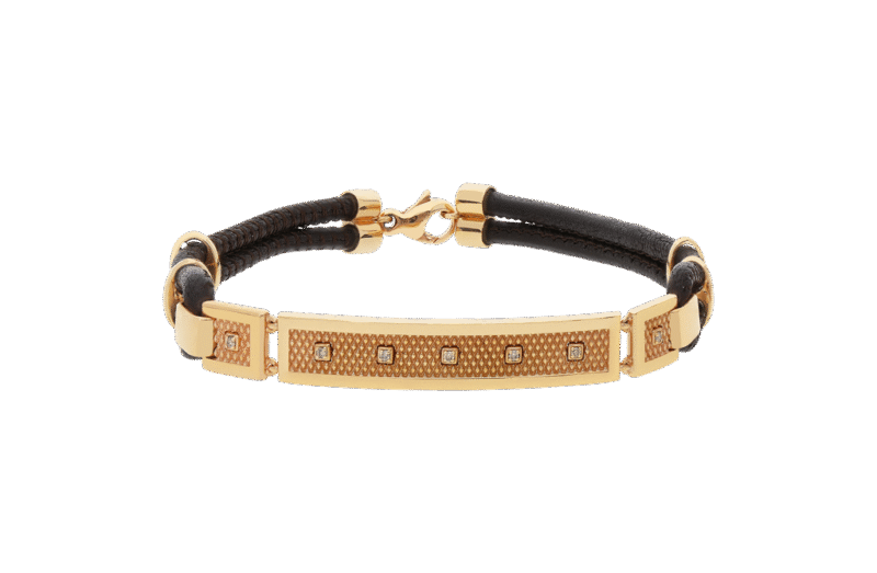 11,50 gram 18 karat RG, diamanten briljant geslepen 0,06 ct, donker bruin leer